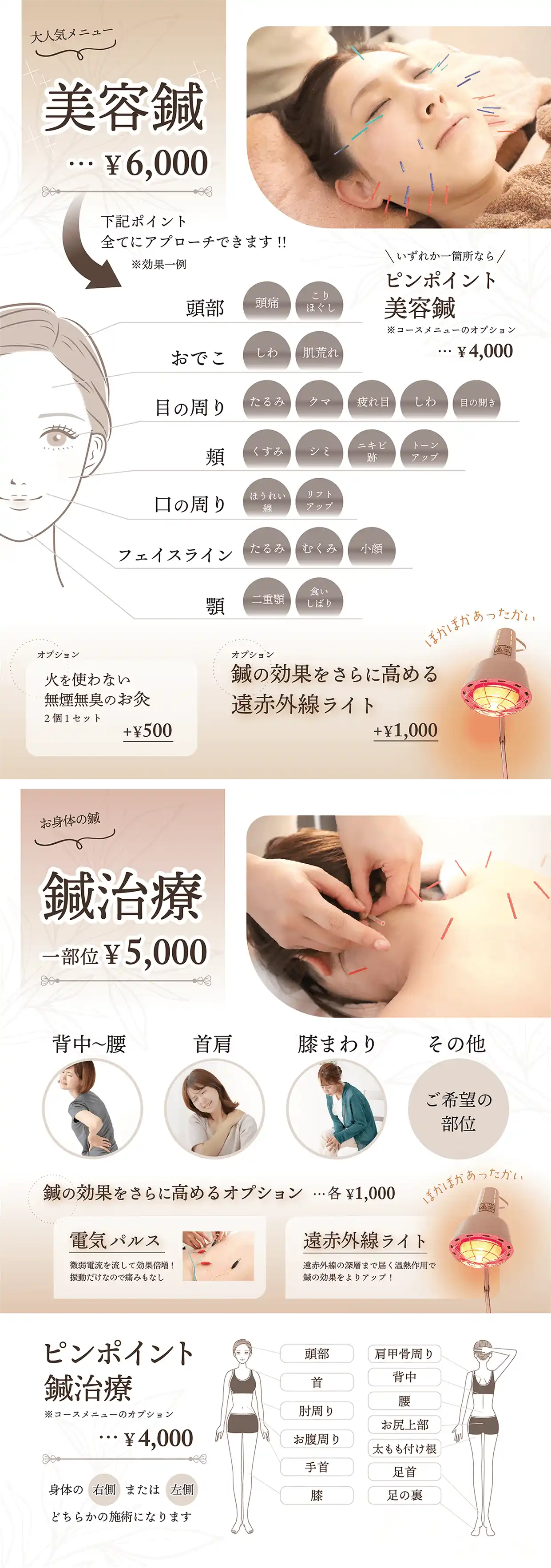 顔の鍼と体の鍼の計2枚のメニューをご希望であり、顔は美容、体は治療のための施術と目的が異なることから、デザインに統一性をもたせながら内容を変化させる必要がありました。美顔鍼のメニューでは「全顔の美容鍼」と「ピンポイント美容鍼」の2種類が選べますが、全顔の鍼をおすすめしていきたいというご要望でしたので、ピンポイントの場合との差を視覚的に伝えるためにアプローチ範囲と効果について大きく図を用いて示しています。鍼治療のメニューでは背中〜腰、首肩、膝まわりなどの部位に鍼がうてることを示していますが、それぞれの症状に悩んでいる人の写真を使用することで自身の症状と重ねやすくする効果をねらっています。