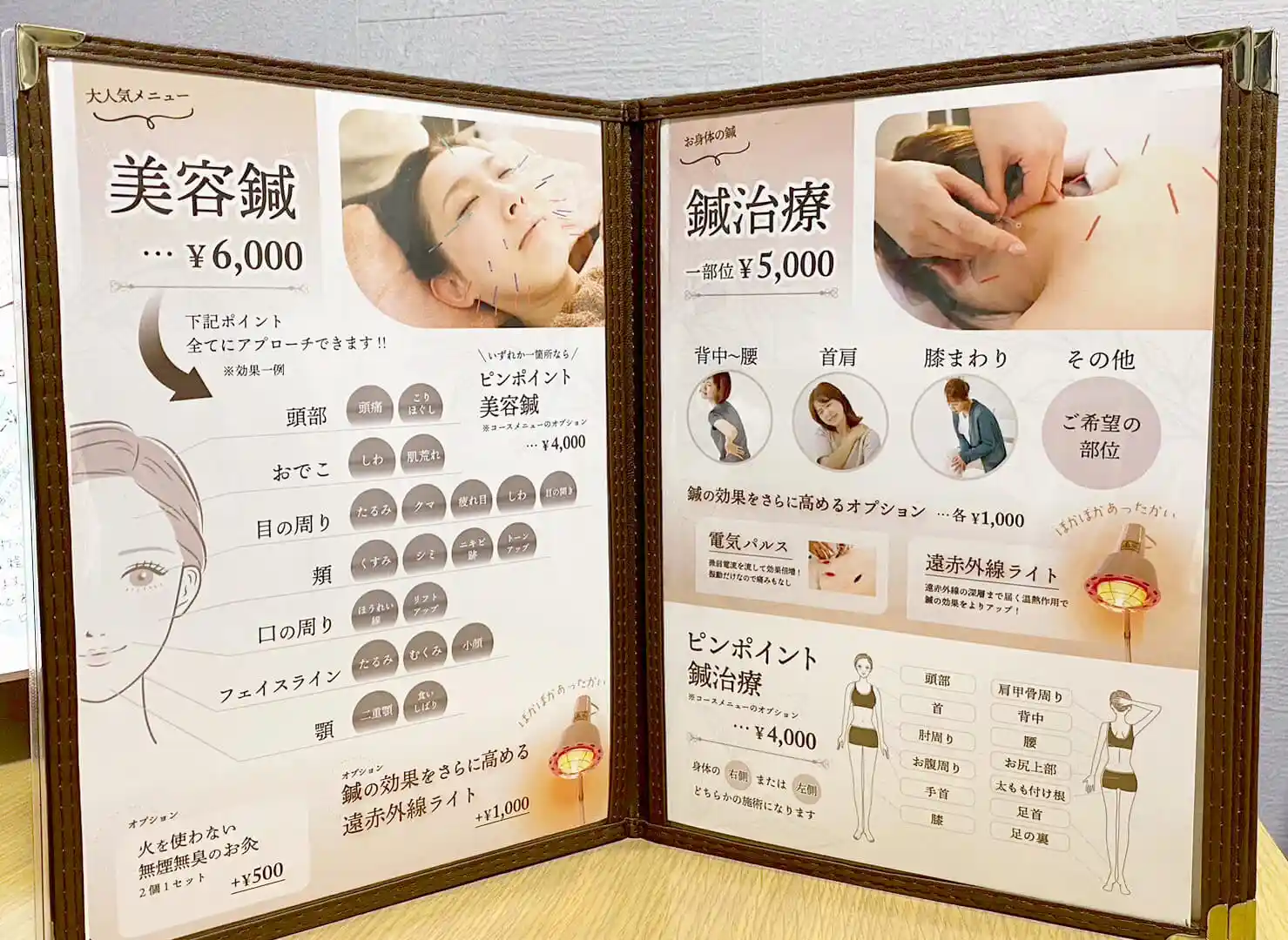 サロンに来店するお客さんで、鍼に興味のある方へのご案内時に使用するメニューがほしいと依頼を受け制作。最近導入した遠赤外線ライトについてもオプションとしておすすめしたい。